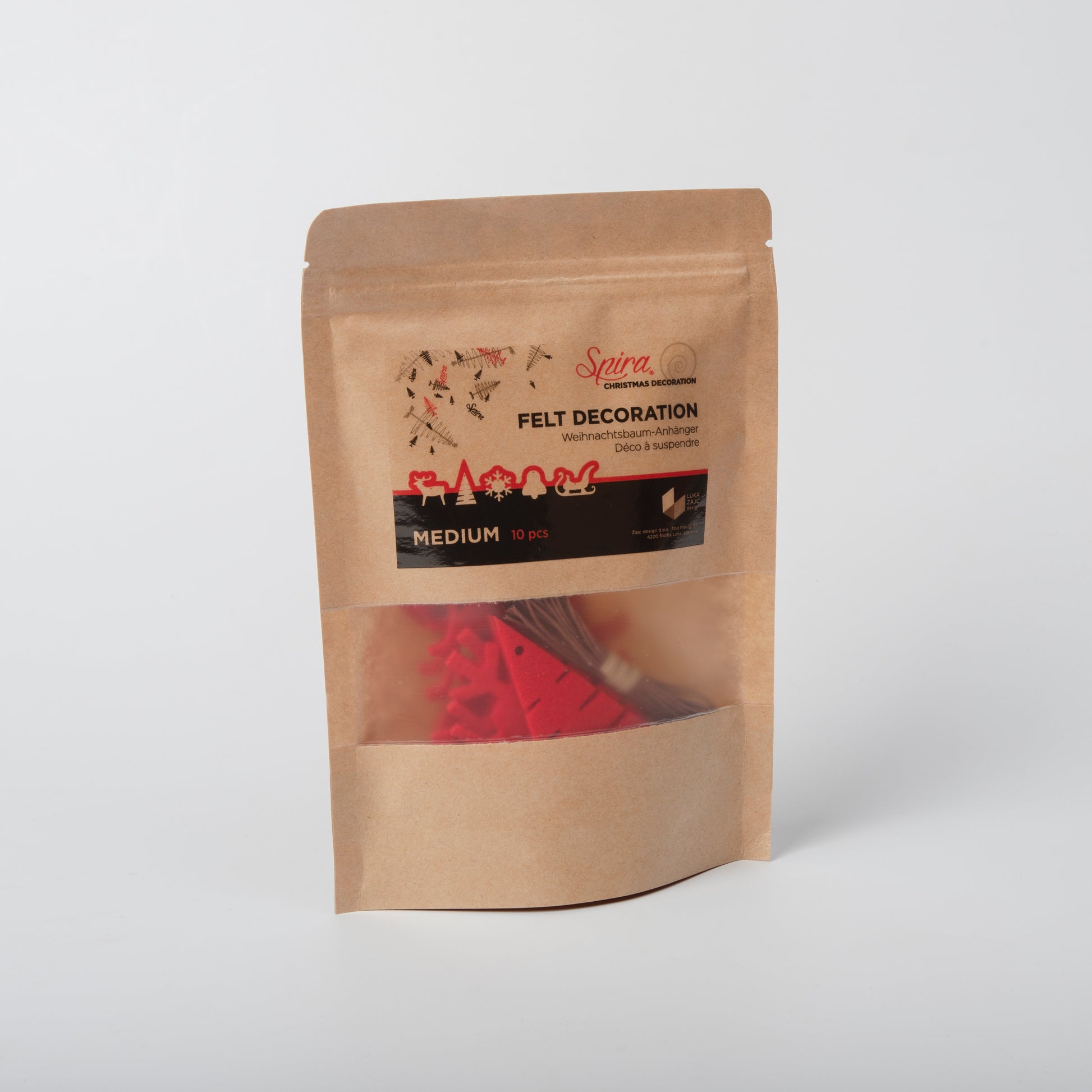 Il set contiene 10 ornamenti in feltro in 5 popolari motivi natalizi. Gli ornamenti sono disponibili in tre diverse dimensioni. Nel set sono compresi anche i cordoncini per appendere le decorazioni.