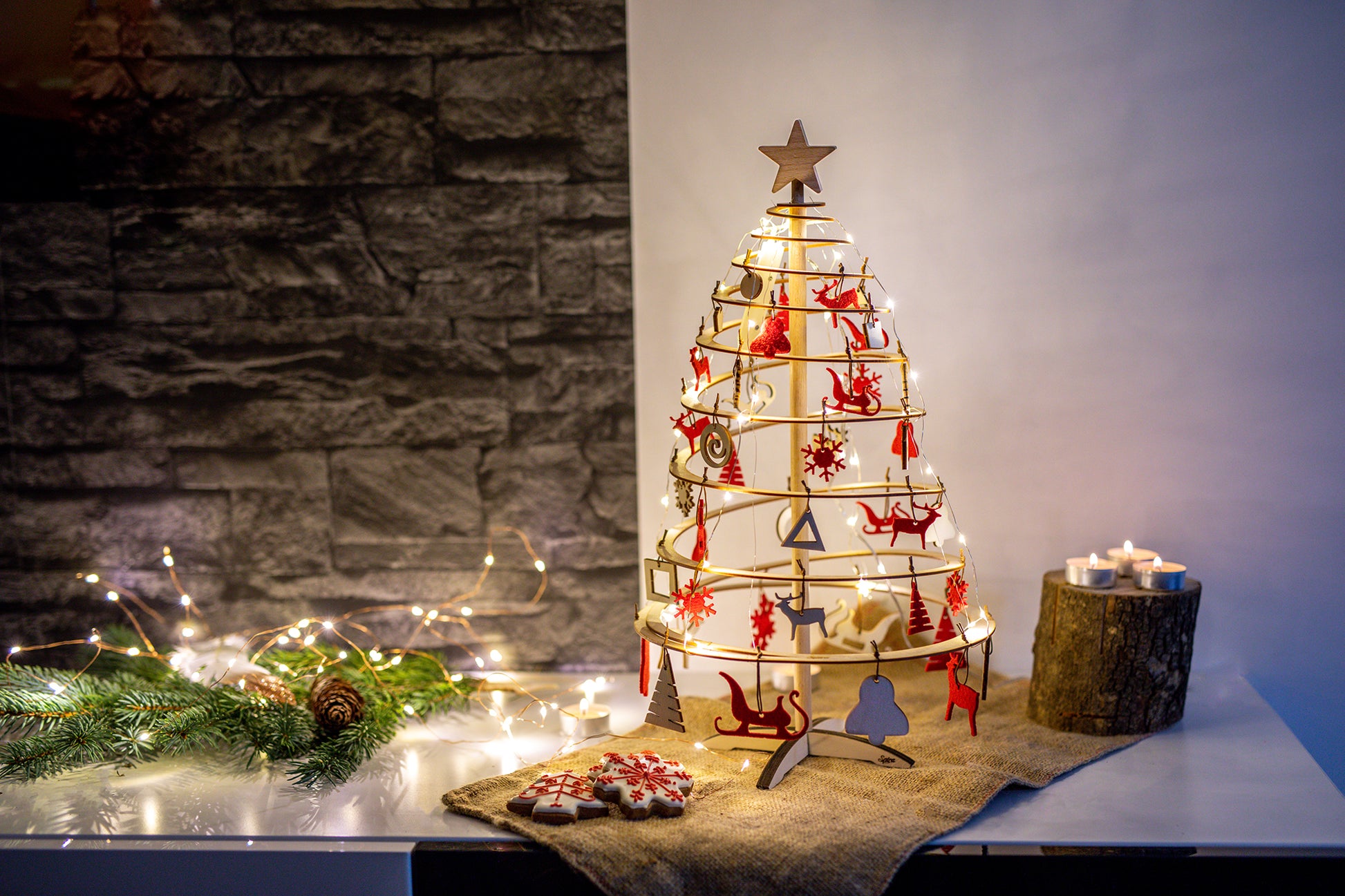 Albero di Natale in legno con decorazioni natalizie in legno e feltro e puntale a forma di stella in legno. Le decorazioni hanno una dimensione compresa tra 3 e 5 cm. La confezione include anche i cordini per appendere la decorazione.