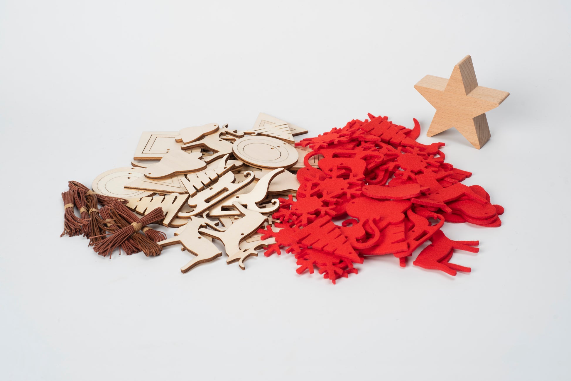 Il set include una stella in legno per puntare l'albero e un numero adeguato di ornamenti in feltro rosso e legno. I cavi per appendere sono inclusi.